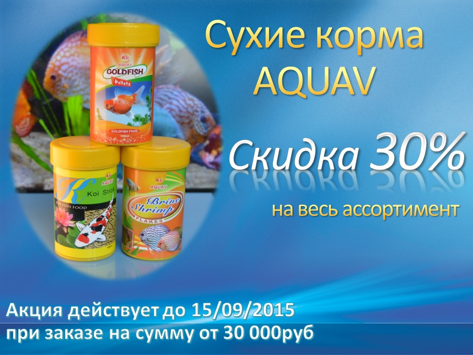 До 15 сентября действует 30% скидка на ВЕСЬ ассортимент сухих кормов для рыб и рептилий AQUAV.