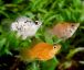Разведение: В природе стая моллинезий насчитывает сотни штук, и соотношении самцов к самкам – один к двум. Действительно, в одном помете обычно бывает до 70% самок. Многие магазины аквариумных рыб часто продают моллинезий парами. Содержание парами не только вредно сказывается на здоровье самки, но и утомляет ее, поскольку самец никогда не оставит ее в покое. Если соотношение самцов и самок в аквариуме – один к двум, стрессы у самок будут значительно меньше. Через каждые 30-40 дней самка моллинезии будет производить на свет от 50 до 100 мальков. Взрослые особи обычно охотиться на своих мальков, поэтому лучше использовать густые заросли растений в виде яванского мха, чтобы дать возможность молоди выжить. Новорожденных мальков можно также поместить в нерестовую камеру («нерестовую ловушку»), пока они не станут крупнее. Однако саму беременную самку никогда не следует сажать в нерестовую камеру, поскольку это обычно приводит к сильнейшим стрессам и может даже вызвать у ней выкидыш эмбрионов.